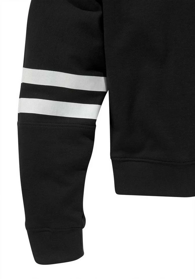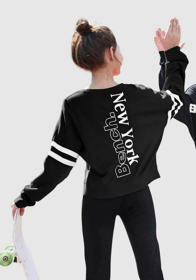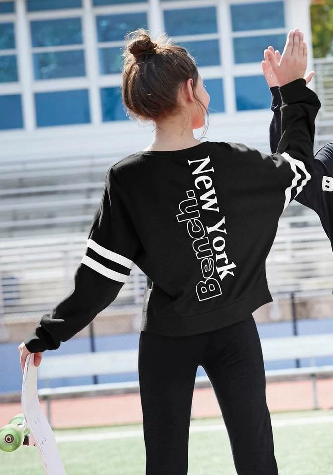 Streetwear-Liebling! Das sportive Shirt von Bench für Mädchen liefert das Coolness-Update für den Kleiderschrank. Seinen urbanen Charakter betont das Longsleeve mit dem kurzen kastigen Fit samt breiter Stretchbündchen als Abschlüsse. Wirkungsvolle Akzente setzen die kontrastierenden Streifen-Details an den Ärmeln. Hinguckereffekt hat auch der plakative Labelprint auf dem Rücken in petto. Ein klassischer Rundhalsausschnitt und die langen, weiten Fledermausärmel runden den dynamischen Look stimmig ab. Durch die softe, griffige Qualität fühlt sich der Pulli besonders gut auf der Haut an, während der weite Schnitt reichlich Bewegungsfreiheit für einen unbeschwerten Alltag mit sich bringt. Fehlen nur noch eine Cargosweathose und Ledersneakers, um den Look zu vervollständigen. Das Shirt von Bench wird als neue Favorit gehandelt!