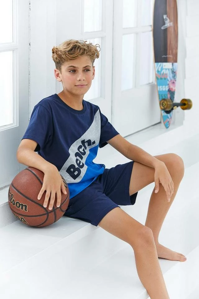 Perfekt für sportliche Jungs: der Shorty von Bench. Das Oberteil des Pyjamas hat einen klassischen Rundhalsausschnitt und erinnert optisch mit seinem Colorblocking, seinem großen diagonalen Markenprint und einem kleineren Nummernprint auf der Vorderseite an ein Fußballtrikot. Die kurzen Schlafshorts haben praktische Seitentaschen und sitzen dank eines Gummizugbundes schön lässig und bequem. Zum Tragekomfort trägt außerdem die hochwertige weiche Baumwollqualität des kurzen Schlafanzuges bei. Er ist optimal für warme Sommernächte geeignet und mit diesem tollen Shorty von Bench kann man nach dem Aufwachen auch noch ganz lässig zum Frühstück auflaufen!