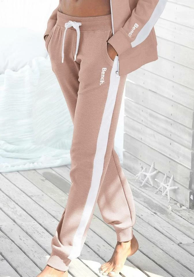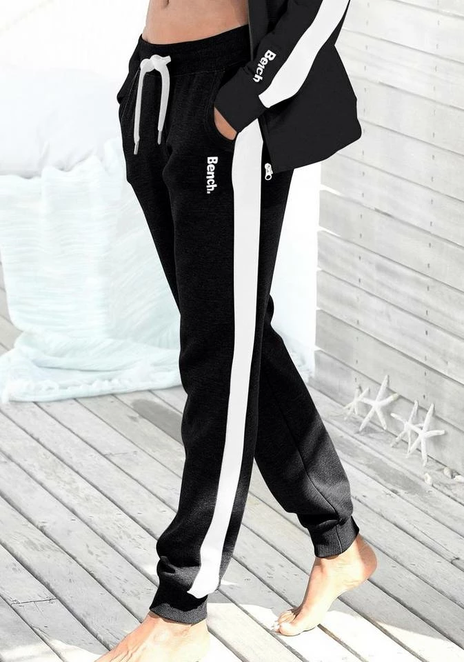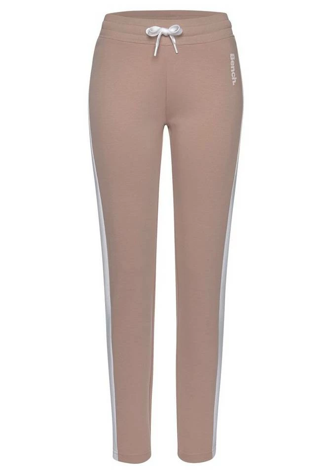 Gemütlich, gemütlicher, die Sweatpants von Bench! Diese sportliche Loungehose mit Logodruck sollte in deiner Garderobe definitiv nicht fehlen, denn sie ist durch ihre softe, elastische Jersey-Qualität ganz besonders bequem und sowohl für sportliche Aktivitäten als auch für gemütliches Chillen bestens geeignet. Für den Fashion-Faktor sorgen aufgesetzte kontrastierende Streifen, die entlang der Seitennaht verlaufen. Durch ihre schmale Hosenbeinform, die ihren Abschluss in einem Rippbündchen findet, machst du trotz aller Gemütlichkeit eine gute Figur. Dank des gerippten Tunnelzugbundes kannst du die Hose mit Kordeln ideal auf deine Größe anpassen. Fühl dich wohl in den Sweatpants von Bench!